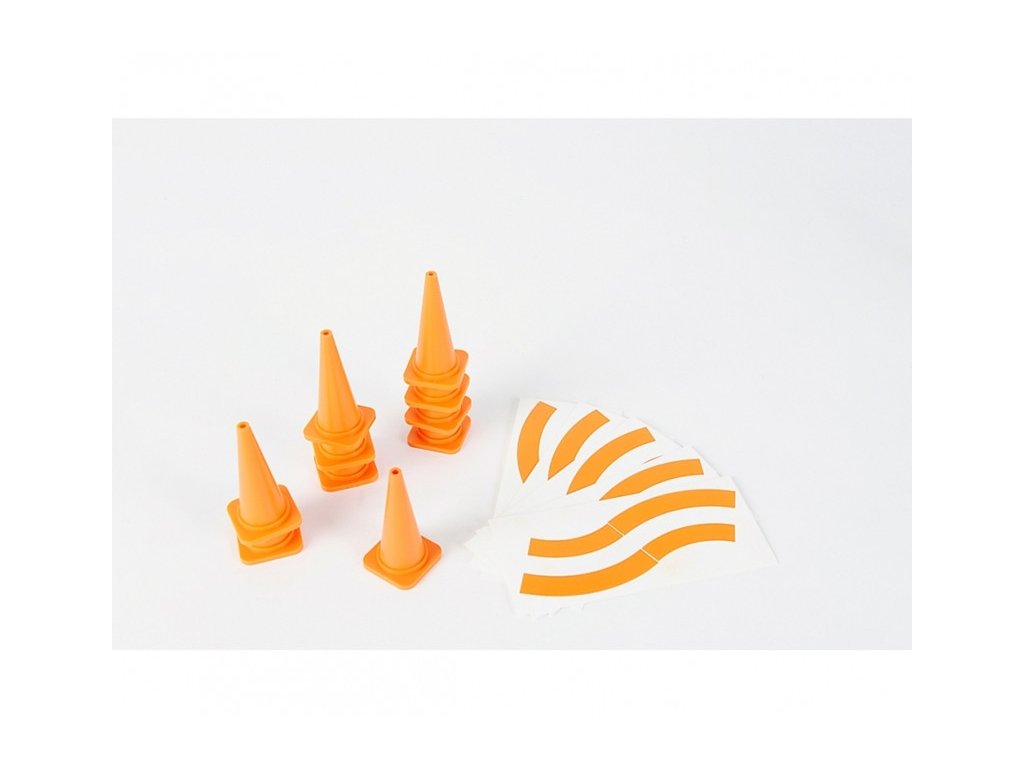Zmenšené modely plastových cestných kužeľov určené ako doplnok k diaľkovo ovládaným (RC) modelom áut, ťahačov, stavebnej techniky a do statických diorám.