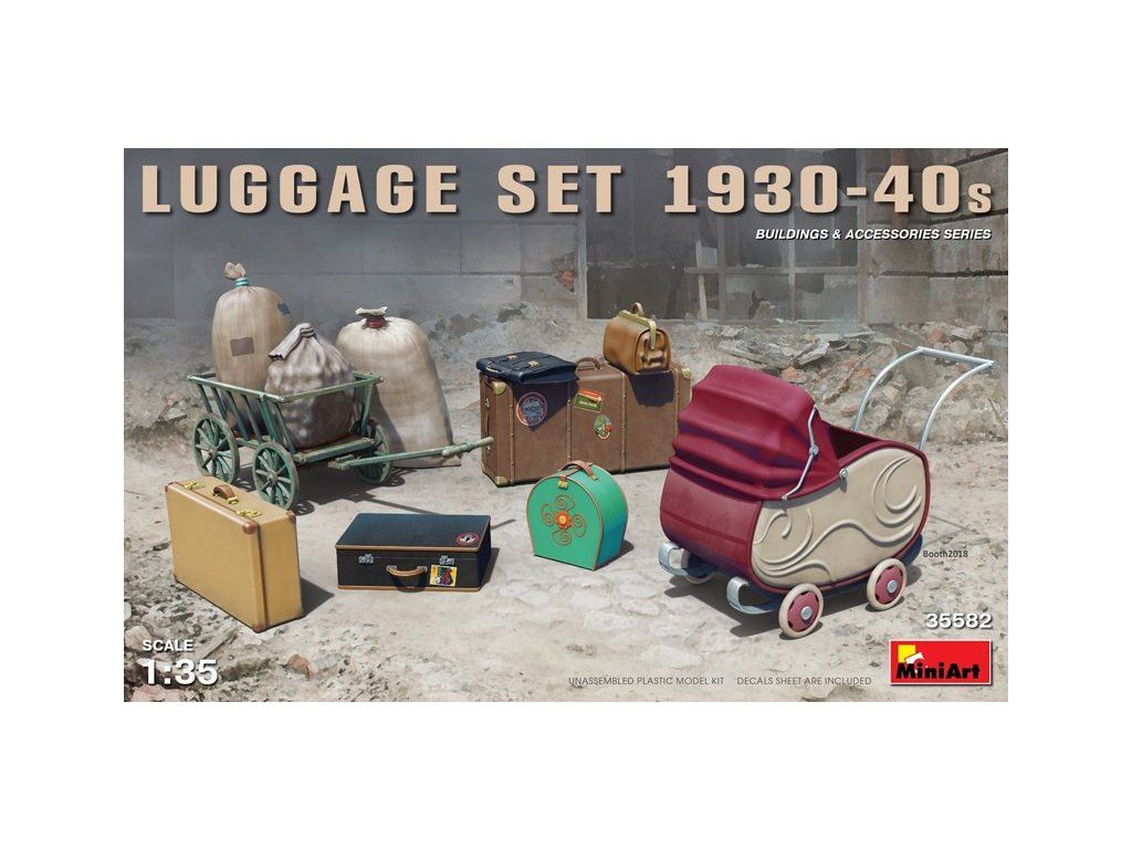 Plastová stavebnica batožiny s príslušenstvom z medzivojnového obdobia vhodná do diorám.