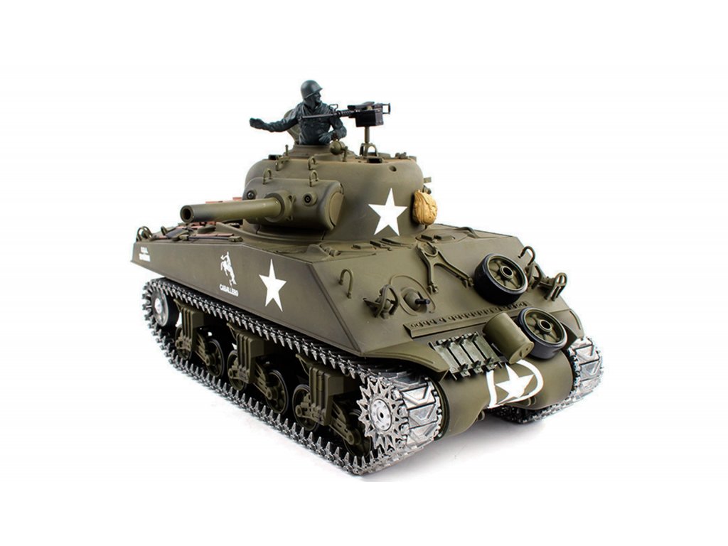 RC model legendárneho amerického tanku z obdobia 2. svetovej vojny s elektrickým pohonom simuluje väčšinu funkcií skutočného tanku. Model je celoplastový, zostavený a nafarbený, drobné detaily sú dodané v krabičke, modelár si ich dopĺňa na povrch modelu sám. Je vybavený realistickým podvozkom s funkčnými pásmi, hnacími, pojazdovými a napínacími kolesami, ktoré umožňujú jazdu dopredu, dozadu a zatáčanie. Prevodovky sú vybavené motormi veľkosti 380. Otáčanie veže je v rozsahu 320 stupňov, námer kanóna (spúšťanie a zdvíhanie) je ovládaný cyklicky podržaním ľavej páky vysielača. Model je vybavený zvukovým modulom imitujúcim zvuk motora, zvuky streľby z guľometu a kanóna. Inštalovaný je aj generátor dymu. Model má kovové pásy, kovové napínacie a hnacie kolesá a prevodovky.