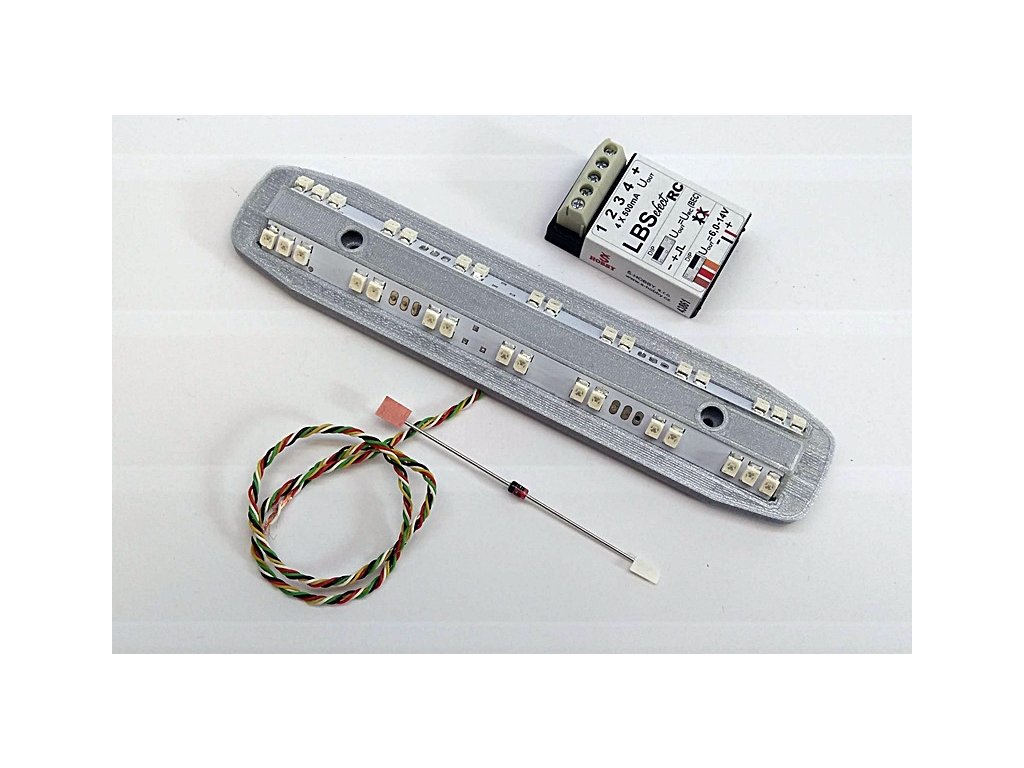 Originál tela majáku je určený pre osadenie 5 LED. Kompletne prepracované telo LED s dvoma lištami vysoko svietivých oranžových LED. Osadené 2x16 LED. Súčasťou je externá riadiaca elektronika LBSefect, ktorá sa spína jedným voľným RC kanálom. Má 4stoboskopické výstupy, ktoré sa použijú nielen pre rozblikanie majáka, ale sú na ne pripojiteľné i bočné výstražné svetlá zo sady Š-hobby 43803.
