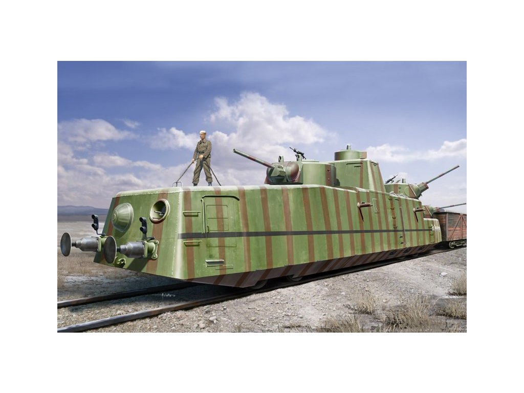 Stavebnica plastového modelu sovietskej pancierovanej lokomotívy vyzbrojenej delami z obdobia 2. sv. vojny.