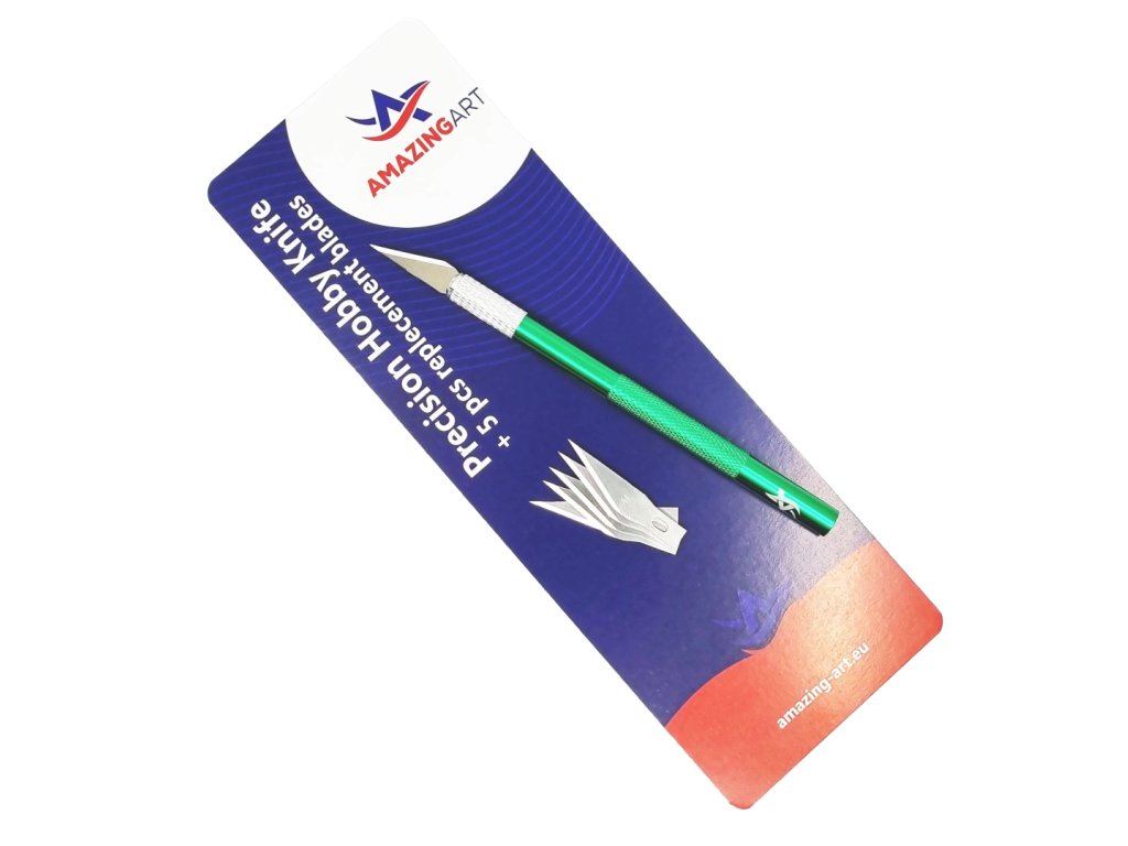 Kvalitný modelársky nôž s kovovou rúčkou v zelenej farbe a protišmykovým ergonomickým povrchom. Vhodný pre všetky jemné modelárske alebo iné hobby práce. Súčasťou balenia je aj 5 náhradných čepelí.