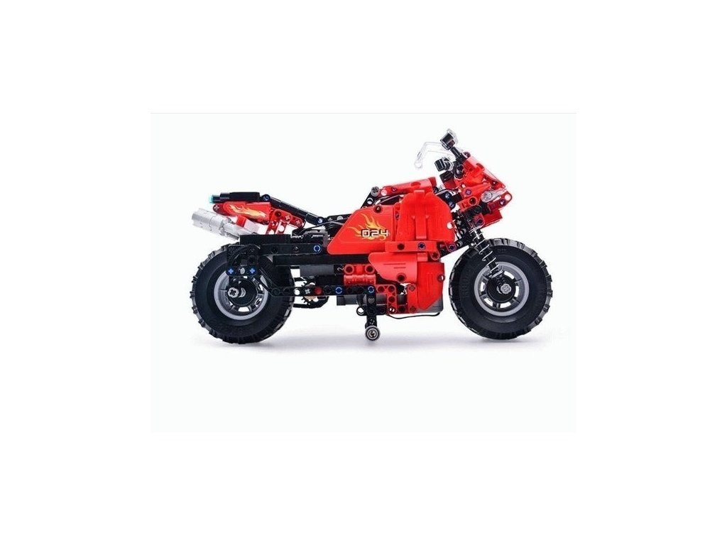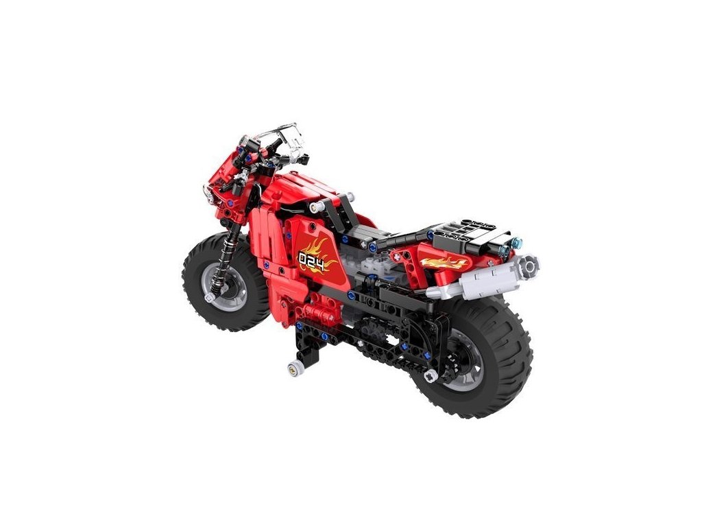 Polytechnická stavebnica modelu motocykla na diaľkové ovládanie vyrobeného z kociek, z kvalitného ABS materiálu. Obe kolesá sú odpružené.