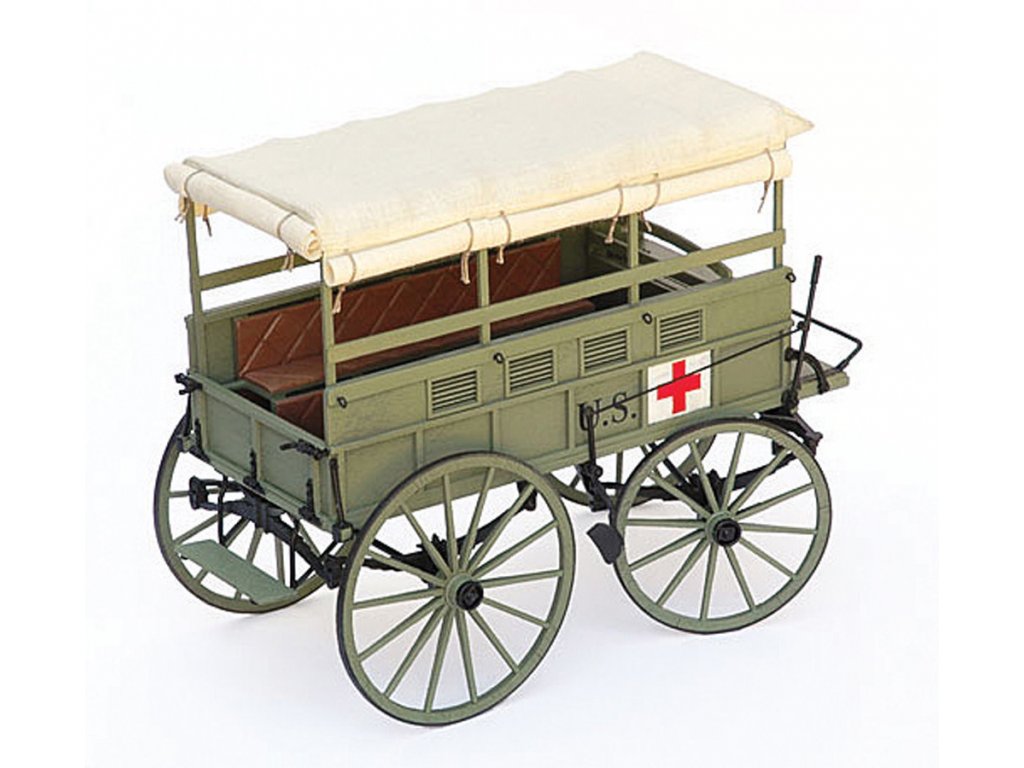 Stavebnica dreveného modelu s kovovými prvkami zachranárského vagóna z obdobia občianskej vojny určeného na transport ranených vojakov z fronty.
