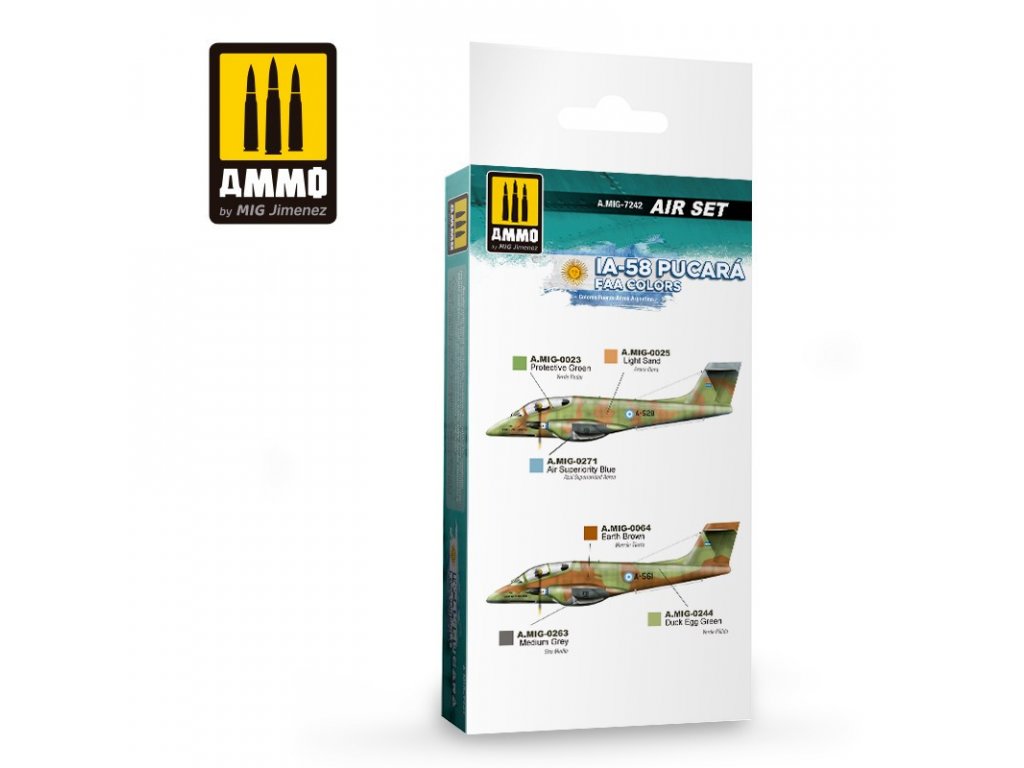 Sada modelárskych akrylových farieb značky Ammo určená pre nafarbenie alebo nastriekanie modelov lietadiel IA-58 Pucara v službách Argentínskeho letectva, ktoré boli v prevádzke počas vojny o Falklandy v roku 1982.