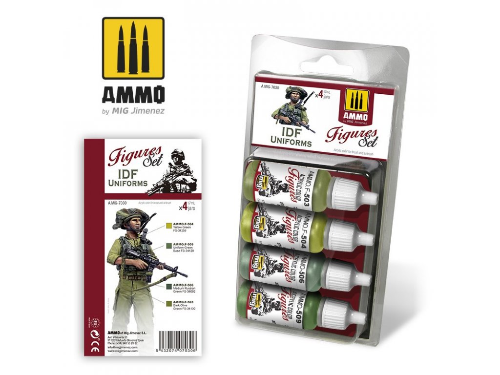 Sada modelárskych akrylových farieb značky Ammo určená pre nafarbenie alebo nastriekanie uniforiem figúrok príslušníkov Izraelských obranných síl (IDF) zo súčasnosti.