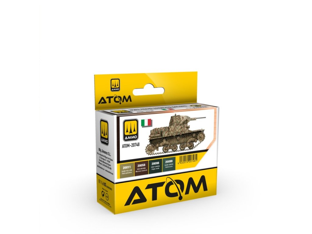 Sada vysoko kvalitných akrylových farieb ATOM určená na maľovanie alebo nastriekanie modelov vojenskej techniky v službách Talianskej kráľovskej armády počas 2. svetovej vojny.