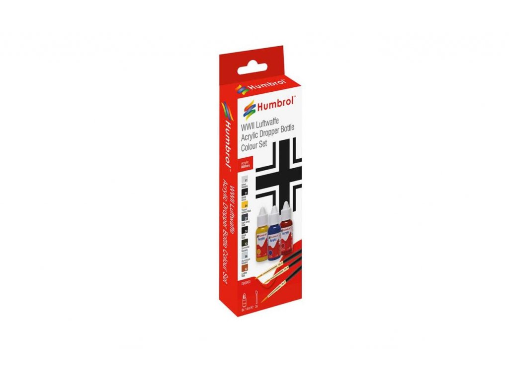 Sada modelárskych akrylových farieb Humbrol určená na maľovanie alebo striekanie modelov nemeckých lietadiel z 2. svetovej vojny. Súčasťou balenia sú aj 3 štetce.