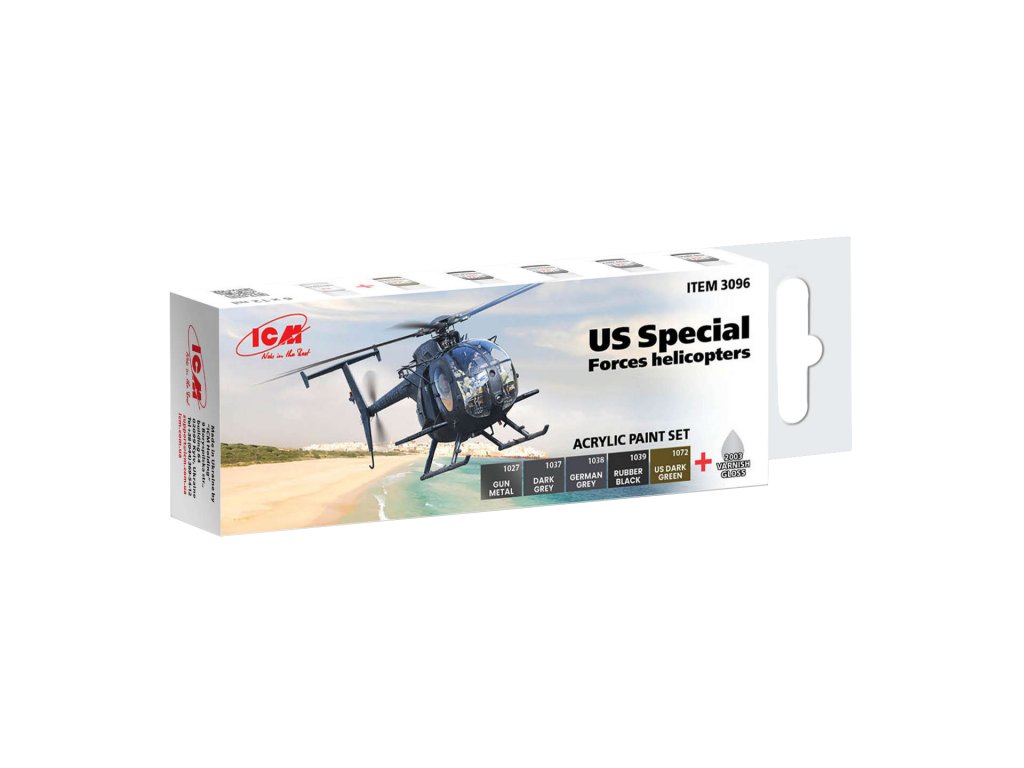 Sada modelárskych akrylových farieb značky ICM určená pre nafarbenie alebo nastriekanie modelov helikoptér v službách US Special Forces.