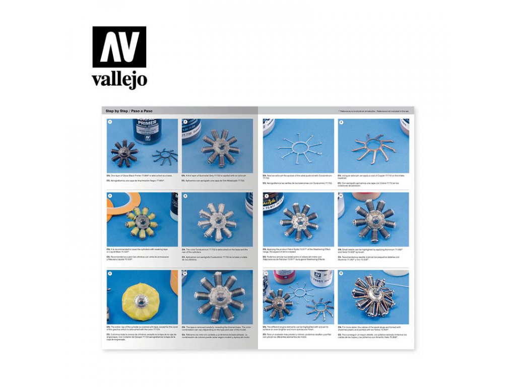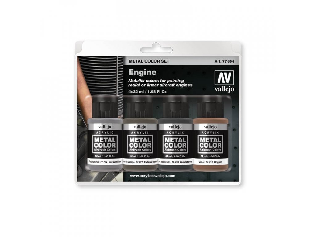 Sada modelárskych akrylových farieb Vallejo Metal Color určená pre nafarbenie alebo nastriekanie radiálnych alebo lineárnych leteckých motorov.