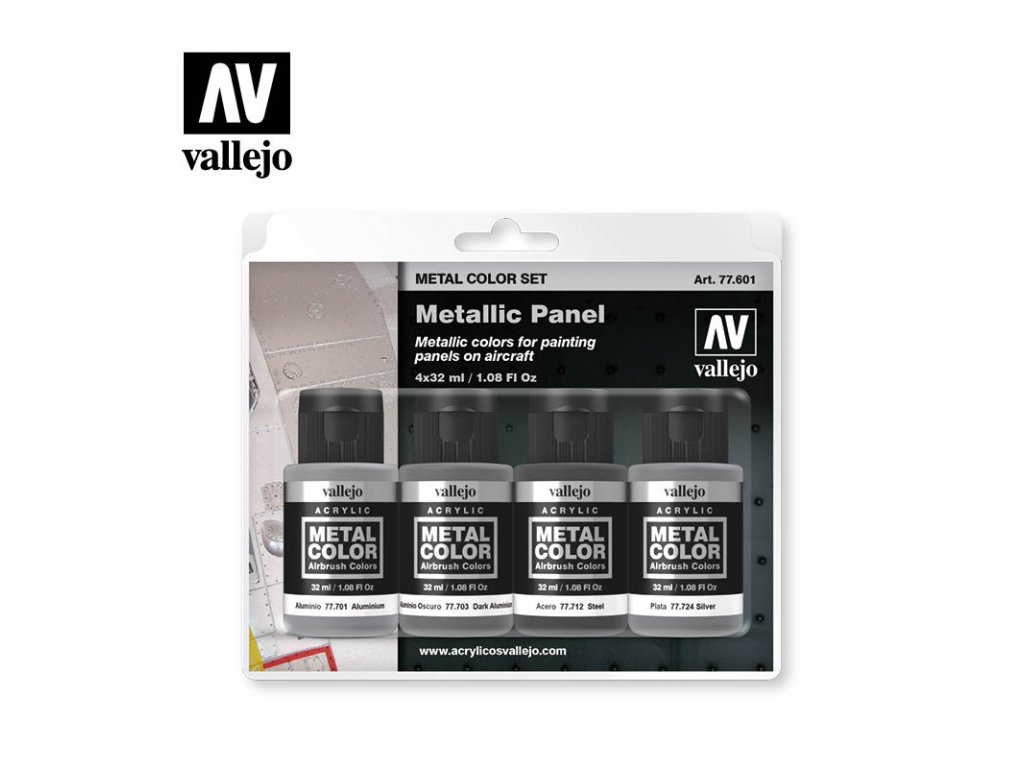 Sada modelárskych akrylových farieb Vallejo Metal Color určená pre nafarbenie alebo nastriekanie panelov na lietadlách.