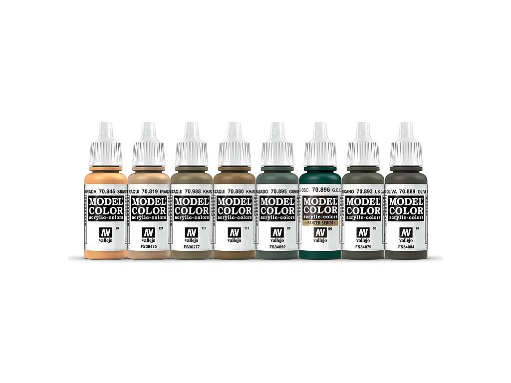 Sada modelárskych akrylových farieb Vallejo Model Color určená pre nafarbenie alebo nastriekanie figúrok amerických tankových posádok z 2. svetovej vojny.