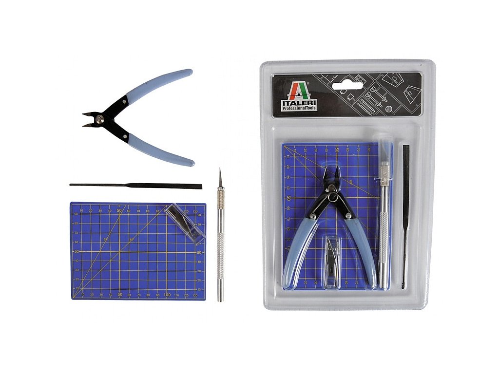 Základná sada náradia, ktoré potrebuje každý začínajúci plastikový modelár. Obsahuje všetky základné náradia potrebné pre stavbu plastového modelu, vrátane rezacej podložky.
