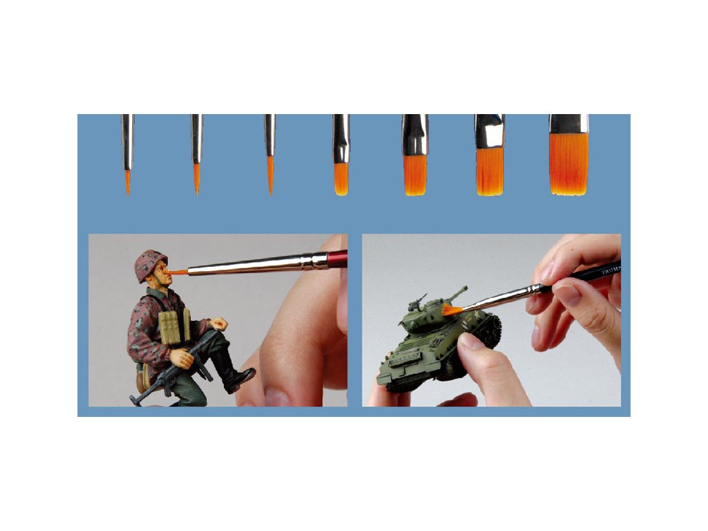 Sada modelárskych štetcov rôznych veľkostí a tvarov Trumpeter určených na maľovanie od veľmi jemných detailov (retušovanie, maľovanie miniatúrnych obrázkov, maľovanie jemných detailov na plastikových alebo železničných modeloch, reštaurátorské práce, maľovanie gélových nechtov a podobne) rôzneho druhu až po veľké plochy.