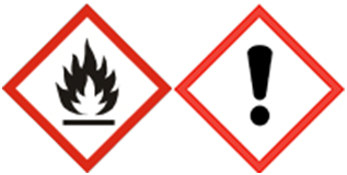 H vety: H226 Horľavá kvapalina a pary. H336 Môže spôsobiť ospalosť alebo závraty. P vety: P101 Ak je potrebná lekárska pomoc, majte k dispozícii obal alebo etiketu výrobku. P102 Uchovávajte mimo dosahu detí. P103 Pred použitím si prečítajte etiketu. P210 Uchovávajte mimo dosahu tepla/iskier/otvoreného ohňa/horúcich povrchov. Nefajčite. P280 Noste ochranné rukavice/ochranný odev/ochranné okuliare/ochranu tváre. P240 Uzemnite/upevnite nádobu a plniace zariadenie. P303+P361+P353 PRI KONTAKTE S POKOŽKOU (alebo vlasmi): Odstráňte/vyzlečte všetky kontaminované časti odevu. Pokožku ihneď opláchnite vodou/sprchou. P405 Uchovávajte uzamknuté. P501 Zneškodnenie obsahu/obalu v súlade s miestnymi/oblastnými/národnými/medzinárodnými nariadeniami. Symboly: viď. nižšie.