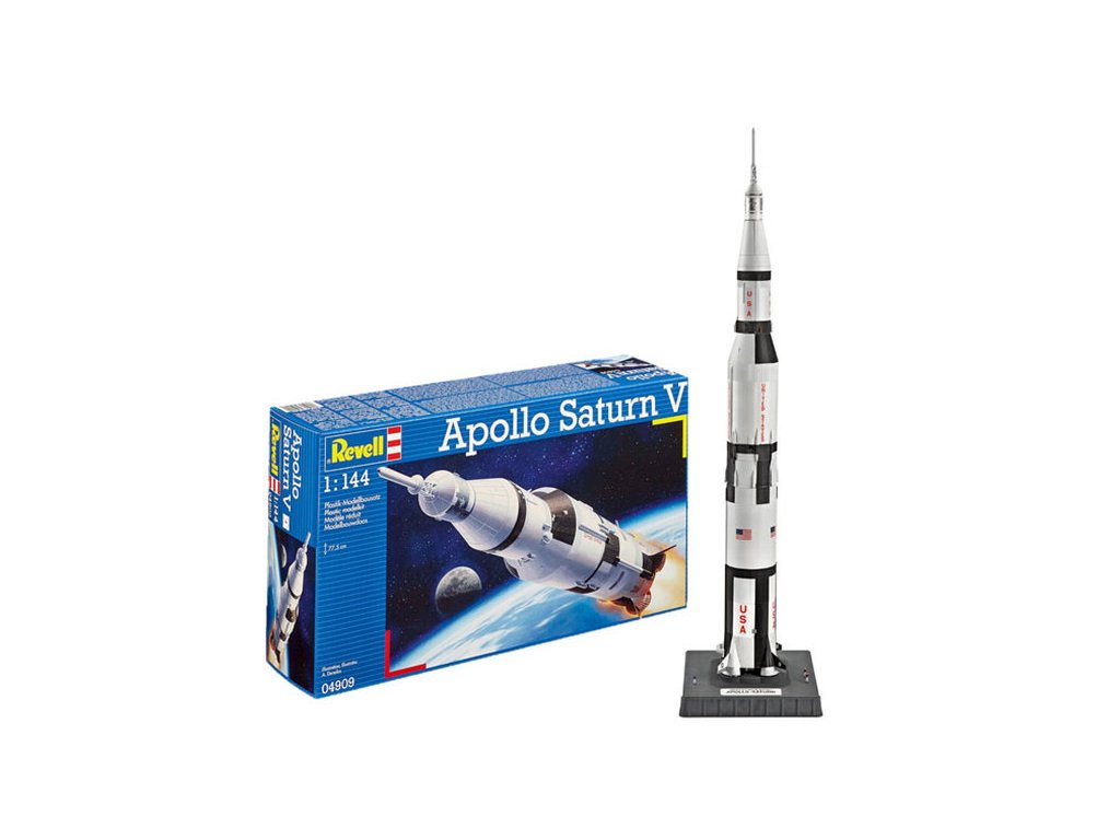 Plastová stavebnica modelu americkej nosnej rakety programu Apollo, ktorá vyniesla prvých kozmonautov na Mesiac.