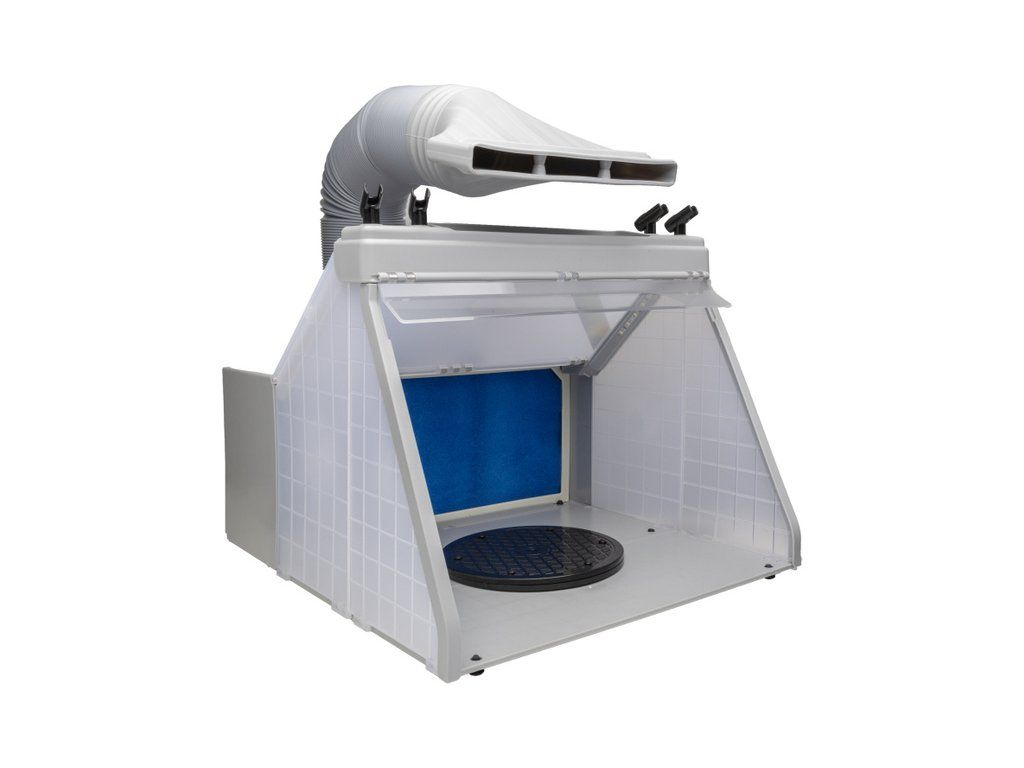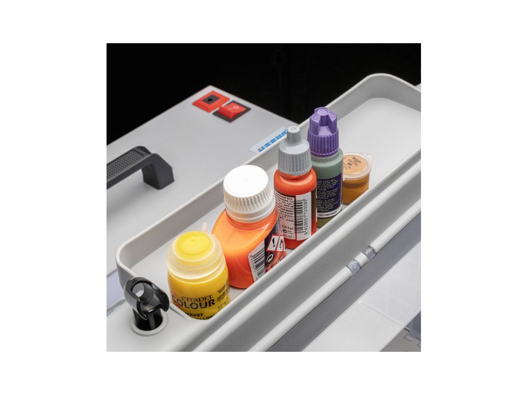Striekací box je praktické riešenie pre všetkých hobby nadšencov, modelárov a profesionálov, ktorí pracujú s airbrushom či sprejmi. Box pomáha zachytiť prebytočnú farbu a výpary pri striekaní, čím udržuje pracovný priestor čistý a zlepšuje pracovné podmienky. Vďaka integrovanému odsávaniu a filtračnému systému s dvoma filtrami zachytí väčšinu rozprášených častíc farby. Tri integrované LED svetelné pásky zaručujú dobrú viditeľnosť pri práci. Na vrchnej strane boxu je priehradka na fľaštičky farieb a držiaky na striekacie pištole.