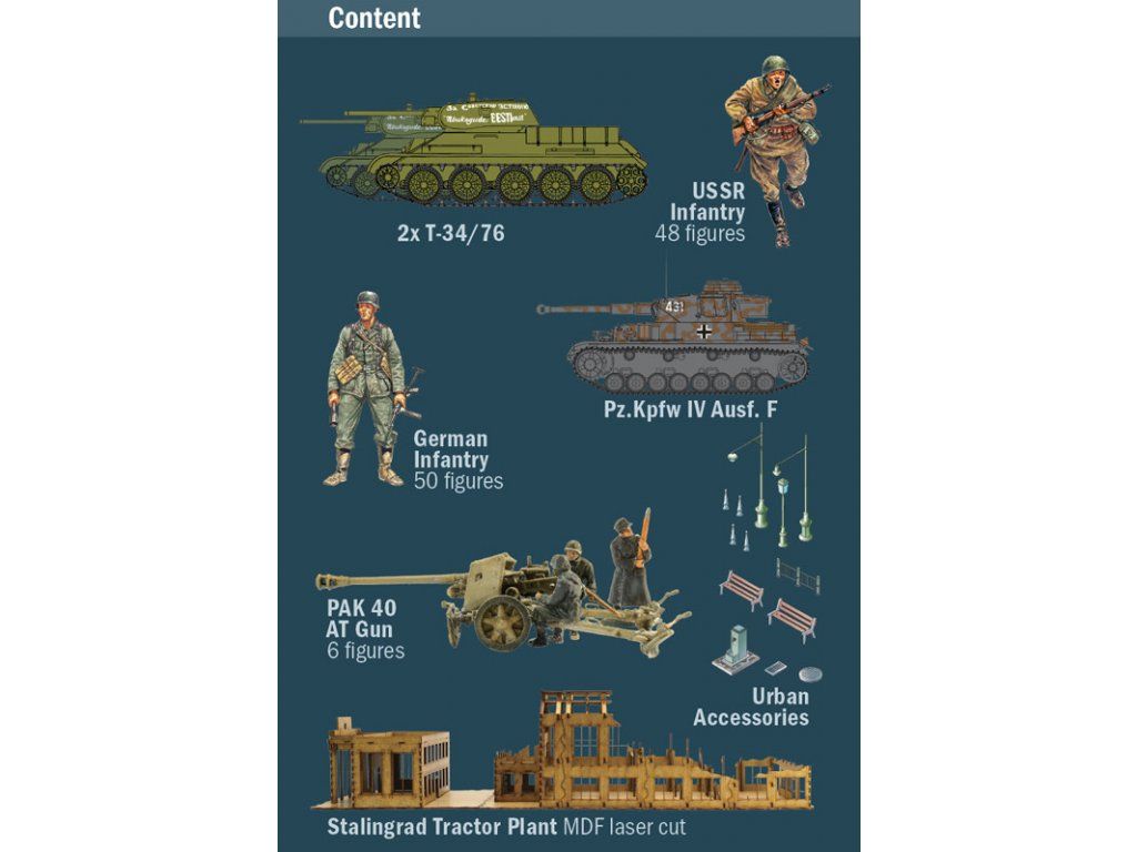 Veľká sada obsahujúca stavebnice modelov tankov, figúrky vojakov sovietskej a nemeckej armády a ruín budov Stalingradu. Výborná sada pre vytvorenie veľkej bohatej diorámy.