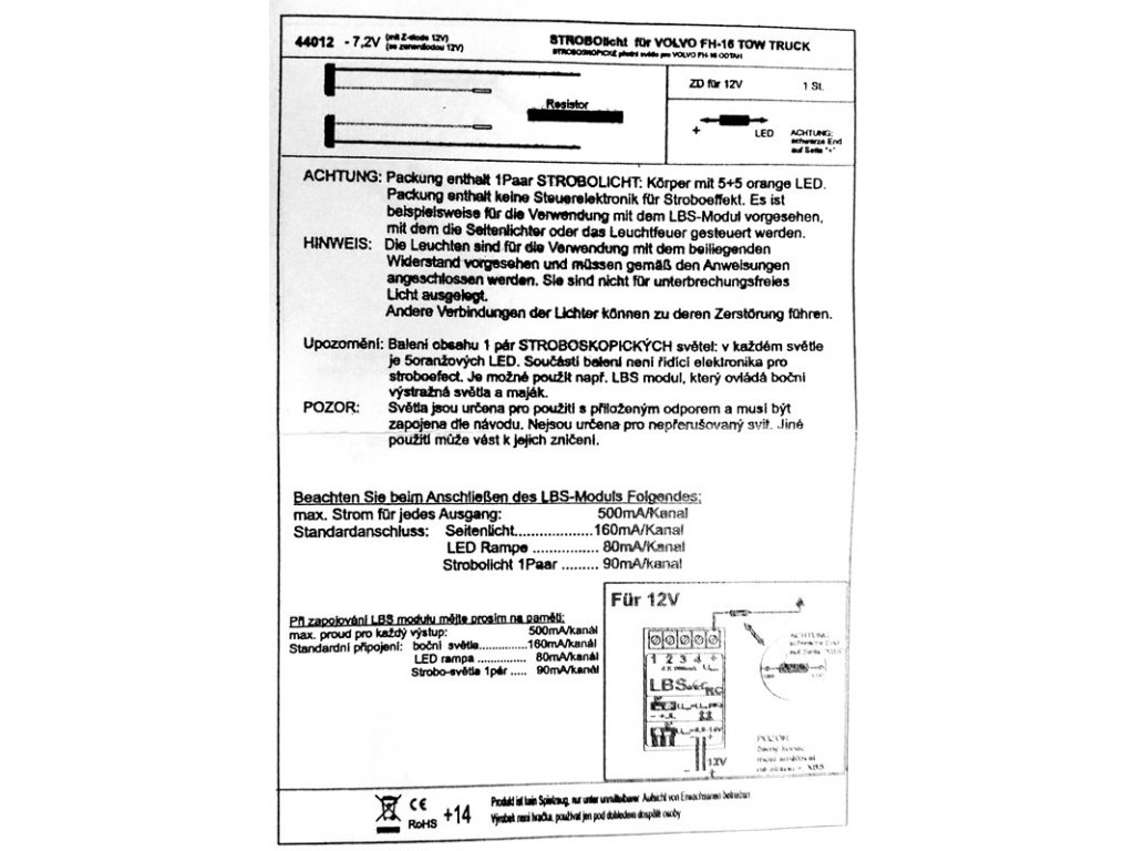POZOR: Svetlá sú určené pre použitie s priloženým odporom a musia byť zapojené podľa návodu. Nie sú určené pre neprerušovaný svit. Iné použitie môže viesť k ich zničeniu. Produkt je určený pre skúsených modelárov, je nutné dôkladne dodržať inštalačný návod a spôsob zapojenia.