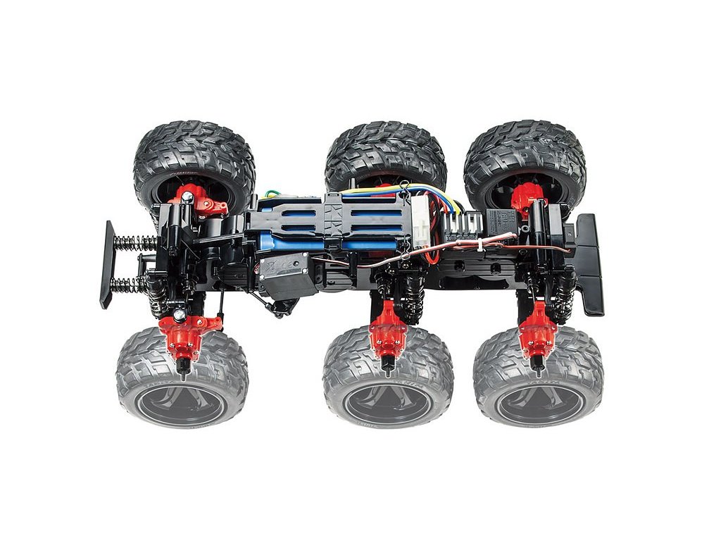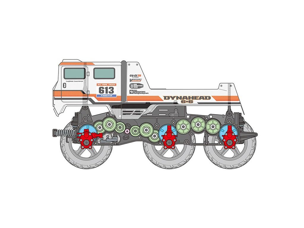 Redukčné prevodovky na pomalé otáčky hnacieho hriadeľa pre každú nápravu poskytujú podvozku G6-01TR s pohonom 6 kolies celkový prevodový pomer 37,35: 1 pre obrovskú trakciu, ktorá spolu so svojou veľkou svetlou výškou umožňuje dostať sa aj do ťažkého off-road terénu. Podvozok je postavený na pevnom, tenkom monokovom ráme. Pohon je zabezpečený motorom za prednými kolesami a výkon prenáša na predné, stredné a zadné kolesá pomocou ozubených kolies. Prevodovka je utesnená, aby bola chránená pred prachom a nečistotami a je integrovaná do rámu. G6-01TR má zabudované predné, stredové a zadné diferenciálne prevody, ktoré poskytujú vynikajúcu trakciu a trvácnosť s použitím dodávaného diferenciálového tmelu. Dvojité závesné pruženie je vybavené trecími tlmičmi, zatiaľ čo čierne 5-lúčové kolesá sú osadené pneumatikami s "V" vzorom s priemerom 110 mm. S úpravou pruženia a samostatne predávaným vysielačom s funkciou 4WS a R/C dovybavením môžu byť zadné kolesá riaditeľné.