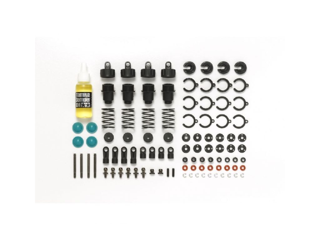 Táto sada plastových tlmičov obsahuje 4 tlmiče naplnené olejom CVA a stredne silné čierne pružiny označené žltou farbou, ktorá znamená strednú silu pružiny pre ľahšiu identifikáciu. Ak sú namontované na niektorom z podvozkov Tamiya TT-01 alebo TT-02, zlepšia stabilitu a pomôžu modelu prekonať nerovnosti povrchu.