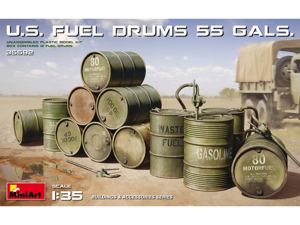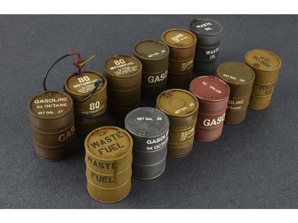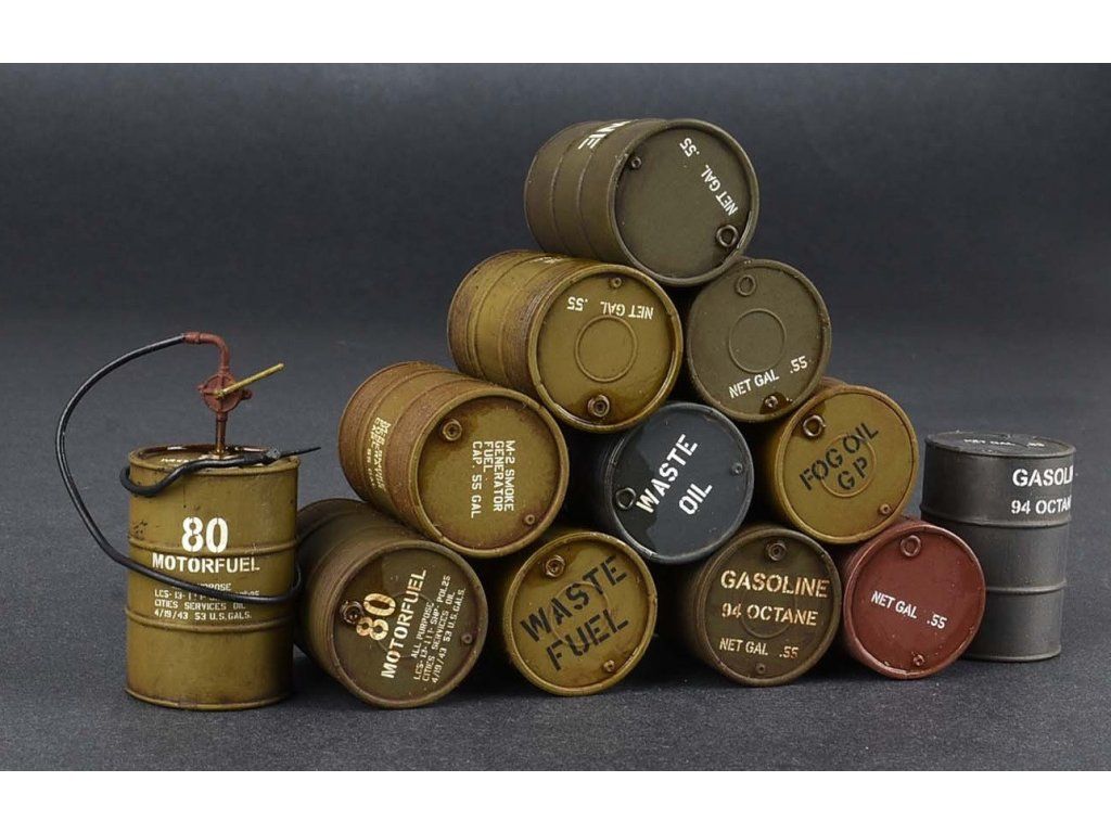 Stavebnica plastových modelov amerických palivových barelov z obdobia 2. svetovej vojny. Vhodný doplnok do rôznych druhov diorám.