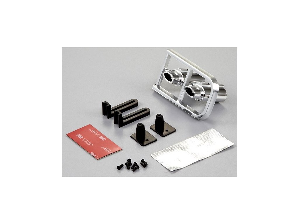 Sada chromovaných plastových koncoviek výfukov pre montáž na RC model auta. Sada obsahuje aj príchytky a upevňovací materiál. Možné je inštalovať aj LED pre imitáciu rozžiarených horúcich výfukov (nie je súčasťou dodávky). Doplnok, ktorý pridá vzhľadu vášho modelu nový stupeň.